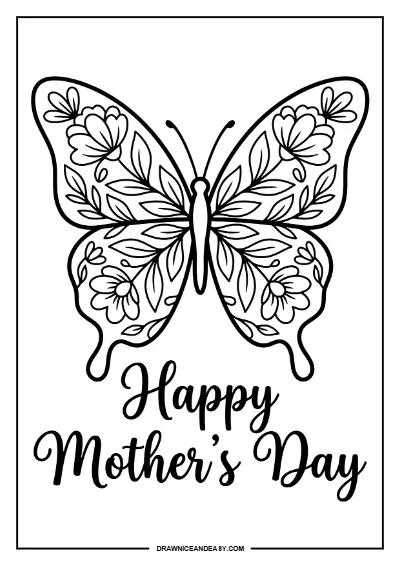 Beautiful butterfly Happy Mother's Day coloring page. Free printable PDF with floral accents.