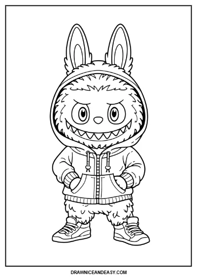 A trendy and cute Labubu coloring page featuring Labubu in a stylish hoodie. Perfect for fashion-loving kids who enjoy free printable Labubu coloring pages.