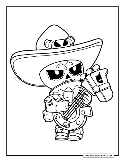 Free Desperado Poco Brawl Stars coloring page – printable PDF! Color the gun-slinging Wild West desperado outlaw-themed Epic skin for the skeleton musician. A tumbleweed-riding and saloon-strumming Poco coloring sheet for kids — download free!