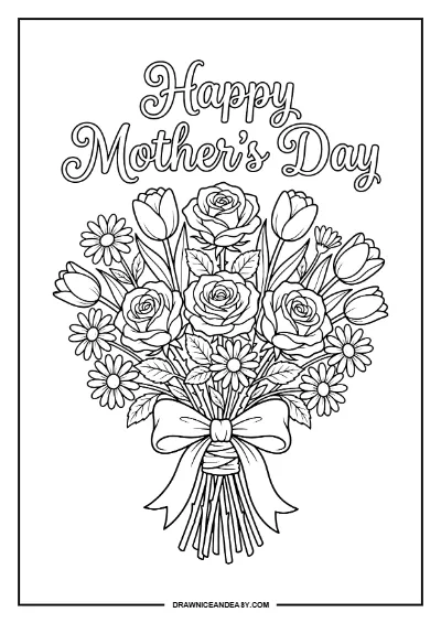 Beautiful bouquet Happy Mother's Day coloring sheet. Free printable PDF.