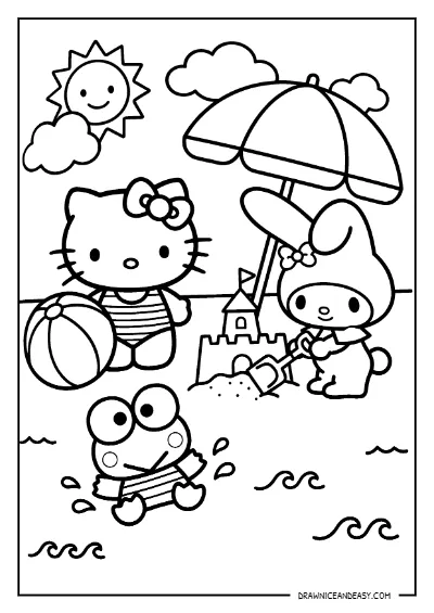 Hello Kitty and Friends Beach Scene Coloring Page – Free Printable PDF