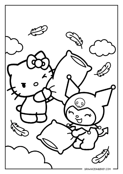 Hello Kitty and Kuromi Pillow Fight Coloring Page – Free Printable PDF