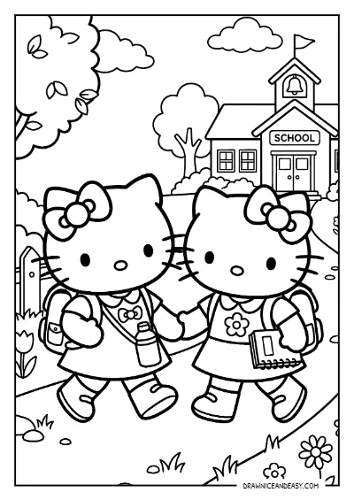 Hello Kitty and Mimmy Walking to School Coloring Page – Free Printable PDF