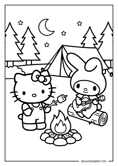 Hello Kitty and My Melody Campfire Coloring Page – Free Printable PDF