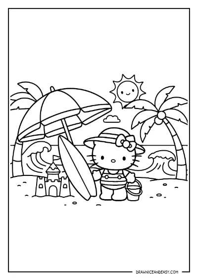Free Hello Kitty beach umbrella coloring page — relaxing summer beach scene with Hello Kitty under the sun! Download as high-quality PDF and print instantly at home. Perfect for summer fun and Hello Kitty beach coloring pages!