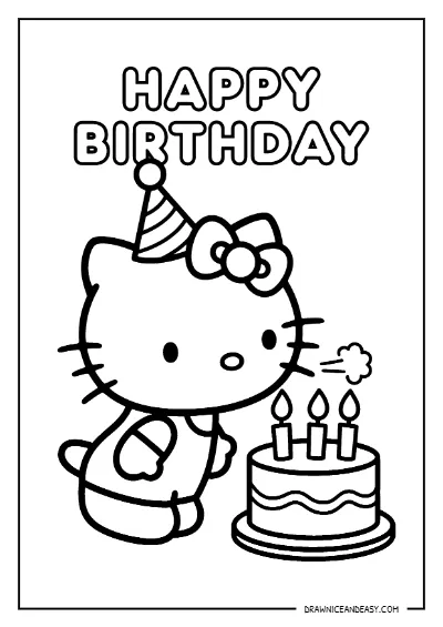 Free Hello Kitty birthday cake with candles coloring page — sweet birthday celebration design! Download as PDF and print instantly. Perfect for birthday parties, kids activities, and Hello Kitty birthday coloring pages!