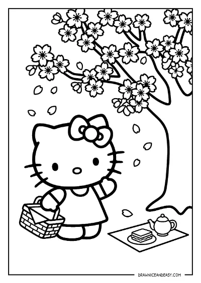 Free printable Hello Kitty cherry blossom tree coloring page — beautiful spring scene with Hello Kitty under blooming cherry blossoms! Download as high-quality PDF and print instantly. Perfect for spring and Hello Kitty fans!