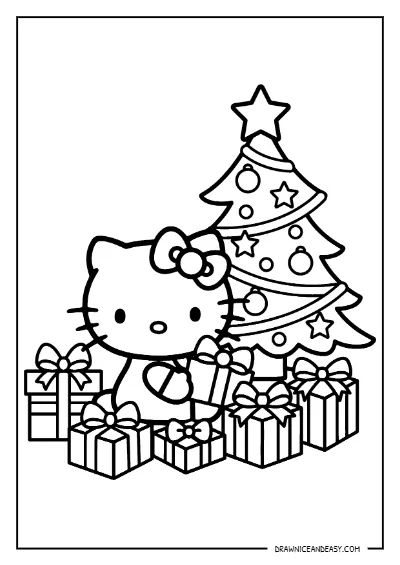 Free Hello Kitty Christmas gifts tree coloring page — festive holiday scene with Hello Kitty, gifts, and Christmas tree! Download as PDF and print instantly. Perfect for Christmas activities and Hello Kitty Christmas coloring pages!