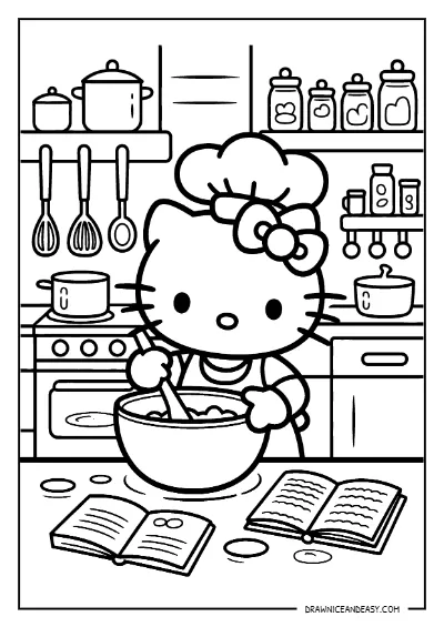 Hello Kitty Baking in Kitchen Coloring Page – Free Printable PDF