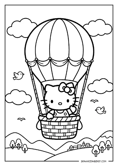 Hello Kitty Hot Air Balloon Sky Adventure Coloring Page – Free Printable PDF