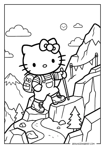 Hello Kitty Mountain Climbing Adventure Coloring Page – Free Printable PDF