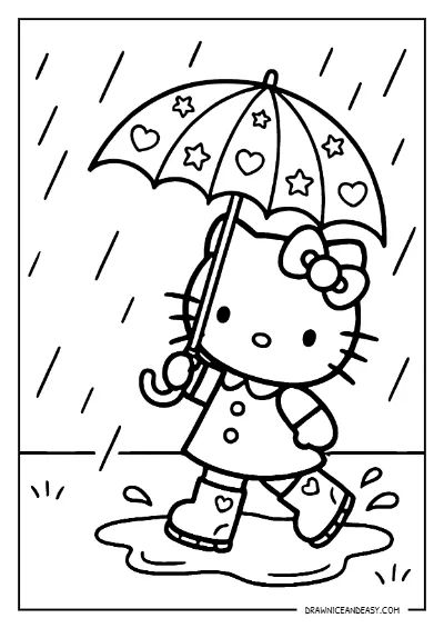 Free Hello Kitty rainy day umbrella coloring page — sweet and cozy rainy day scene with Hello Kitty and her umbrella! Download as PDF and print instantly at home. Perfect for rainy day activities and Hello Kitty everyday life coloring pages!