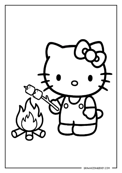 Hello Kitty Roasting Marshmallows Campfire Coloring Page – Free Printable PDF