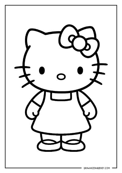Free Hello Kitty standing dress coloring page — adorable Hello Kitty wearing a cute dress design! Download as PDF and print instantly at home. Perfect for fashion-themed activities and Hello Kitty dress coloring pages!