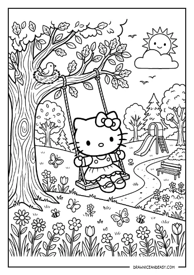 Hello Kitty Tree Nature Scene Coloring Page – Free Printable PDF