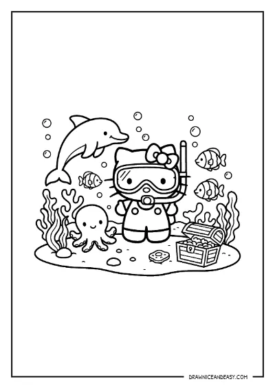 Free Hello Kitty underwater diving coloring page — magical underwater ocean adventure with Hello Kitty diving deep! Download as PDF and print instantly at home. Perfect for ocean lovers and Hello Kitty underwater diving coloring pages!