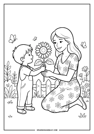Kids Giving Flower to Mom Mother's Day Coloring Page Printable PDF