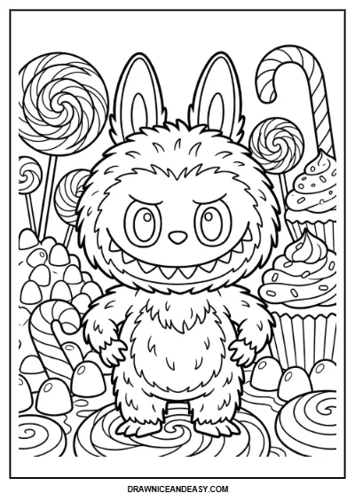Step into candy land with this sweet and free Labubu coloring page. A printable coloring page featuring Labubu surrounded by candy, treats, and colorful fun.