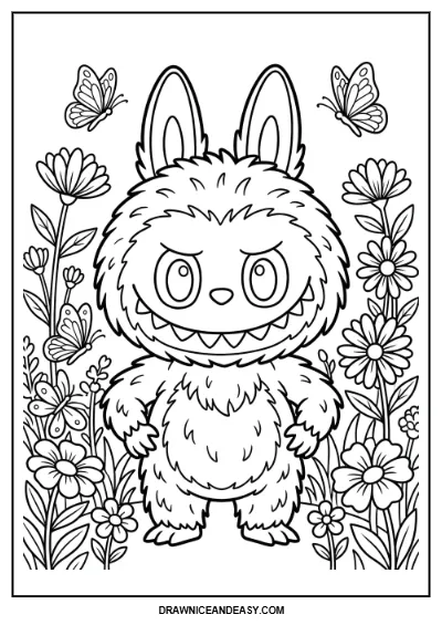 Print this beautiful Labubu flower garden coloring page for free. A lovely scene perfect for kids who enjoy cute Labubu coloring pages with a nature theme.