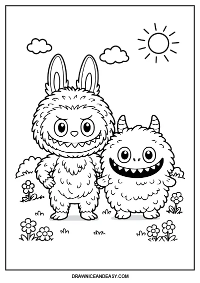 Enjoy this cute Labubu and Mokoko coloring page, free to print. A fun and adorable printable for fans of the Pop Mart Labubu and Mokoko character universe.