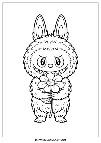 Cute Labubu coloring page printable holding a flower. Easy and fun PDF for kids.