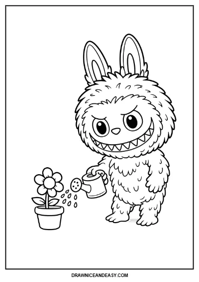 Print this charming Labubu gardening coloring page for free. Featuring Labubu among beautiful blooms, it's a perfect printable for nature-loving kids and fans.