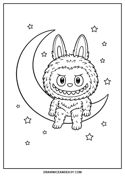 Download a magical Labubu coloring page printable with moon and stars. This free Labubu coloring page PDF is great for creative kids.
