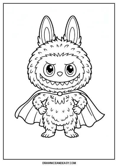 Download this free Labubu superhero cape coloring page in PDF format. A fun and empowering printable Labubu coloring page perfect for kids and superhero fans.